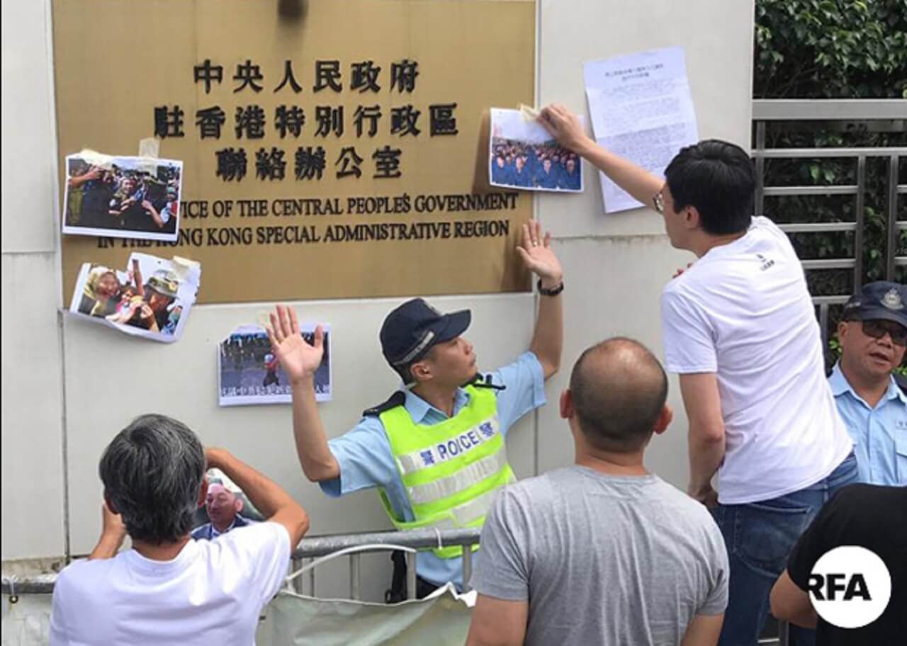 2018年9月2日,游行人士将请愿信等贴在中联办外的墙壁,遭到警察阻挠。(刘少风 摄)