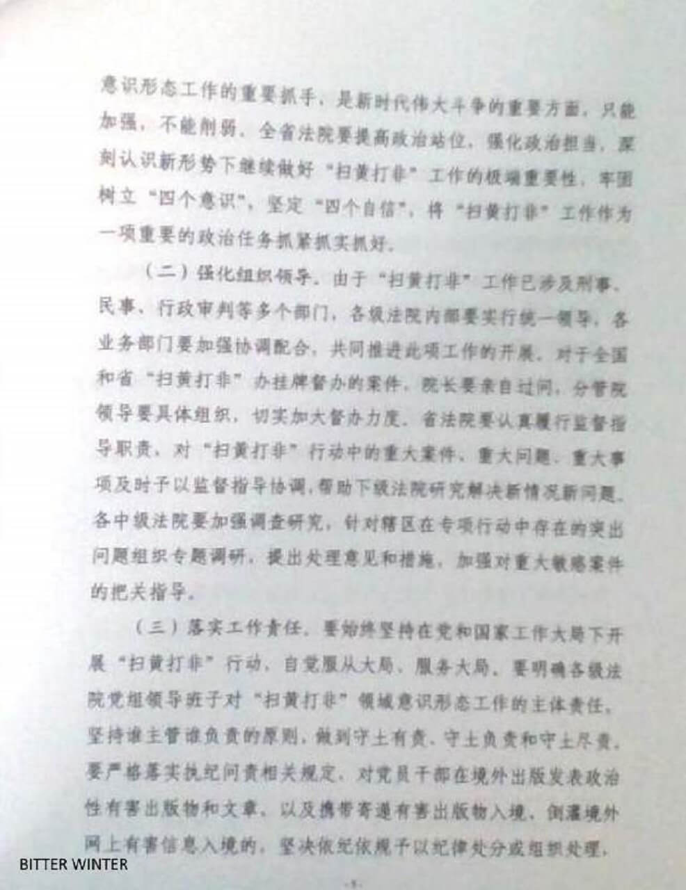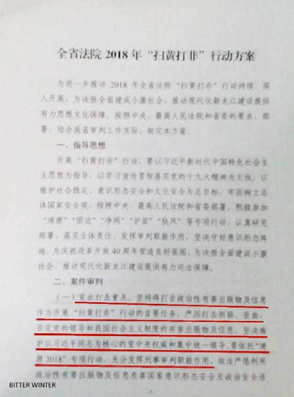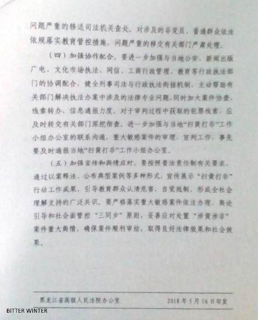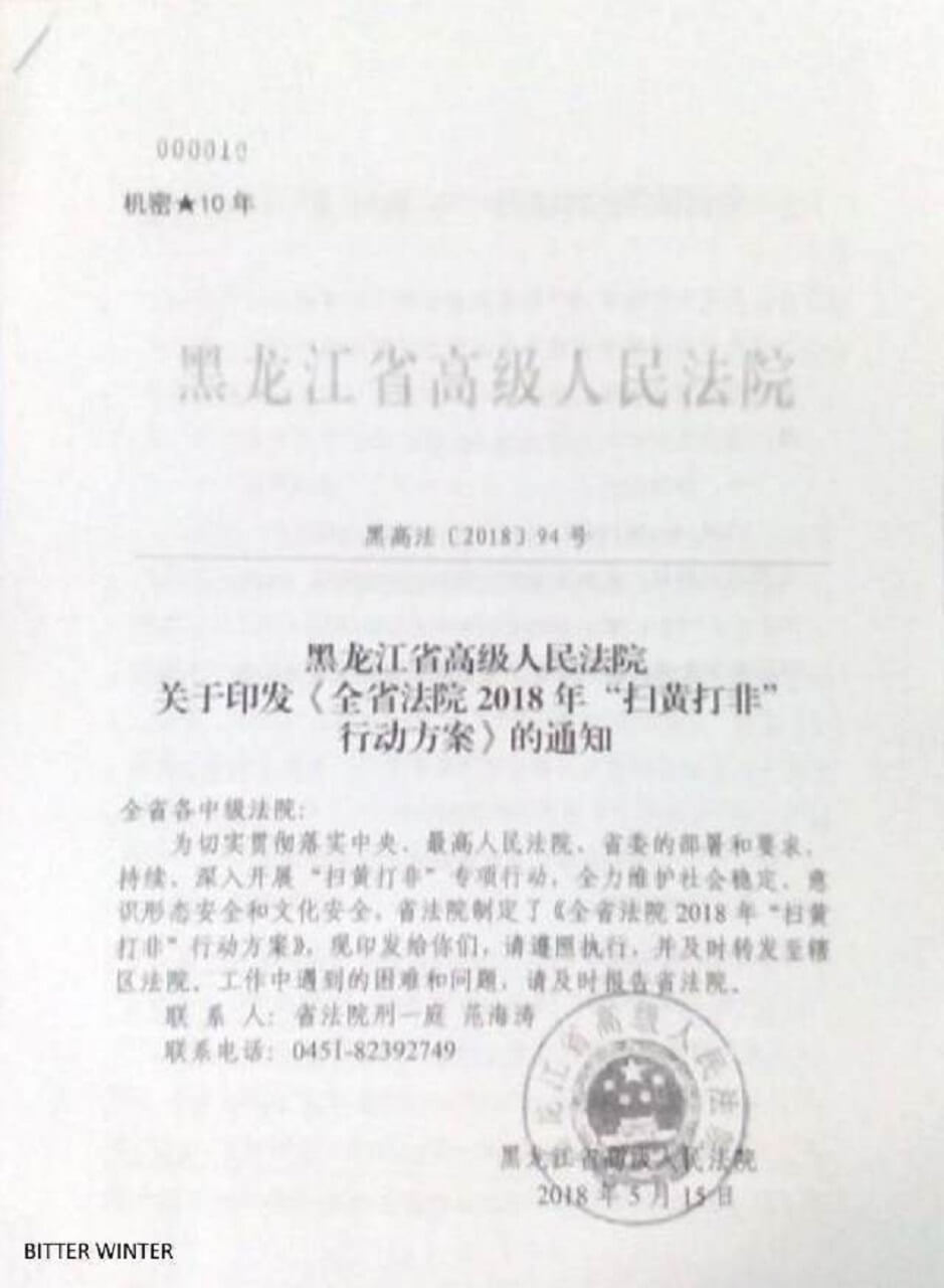 黑龙江省高级人民法院于2018年5月15日下发一份内部文件,名为”黑龙江省高级人民法院关于印发《全省法院2018年“扫黄打非”行动方案》的通知”。文件要求“全省法院要一如既往地……严厉打击‘三股势力(暴力恐怖势力、民族分裂势力和宗教极端势力)’”,并将韩国基督教定为“有害文化渗透”,与法轮功和全能神教会一起列为宗教极端势力。后两者亦被列入中国官方“邪教”(即非正统教义)名单。