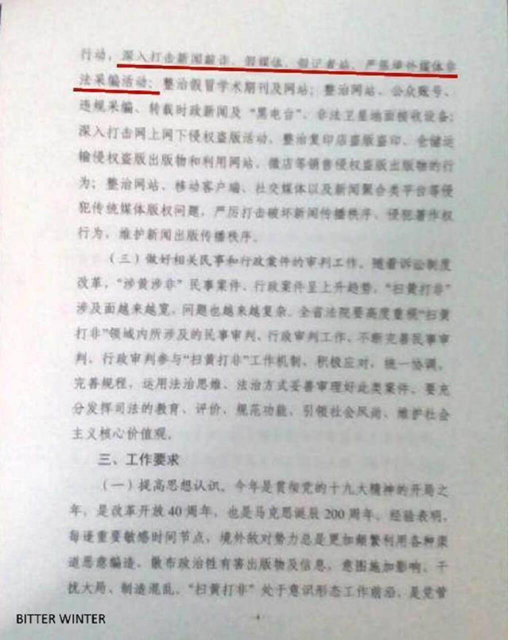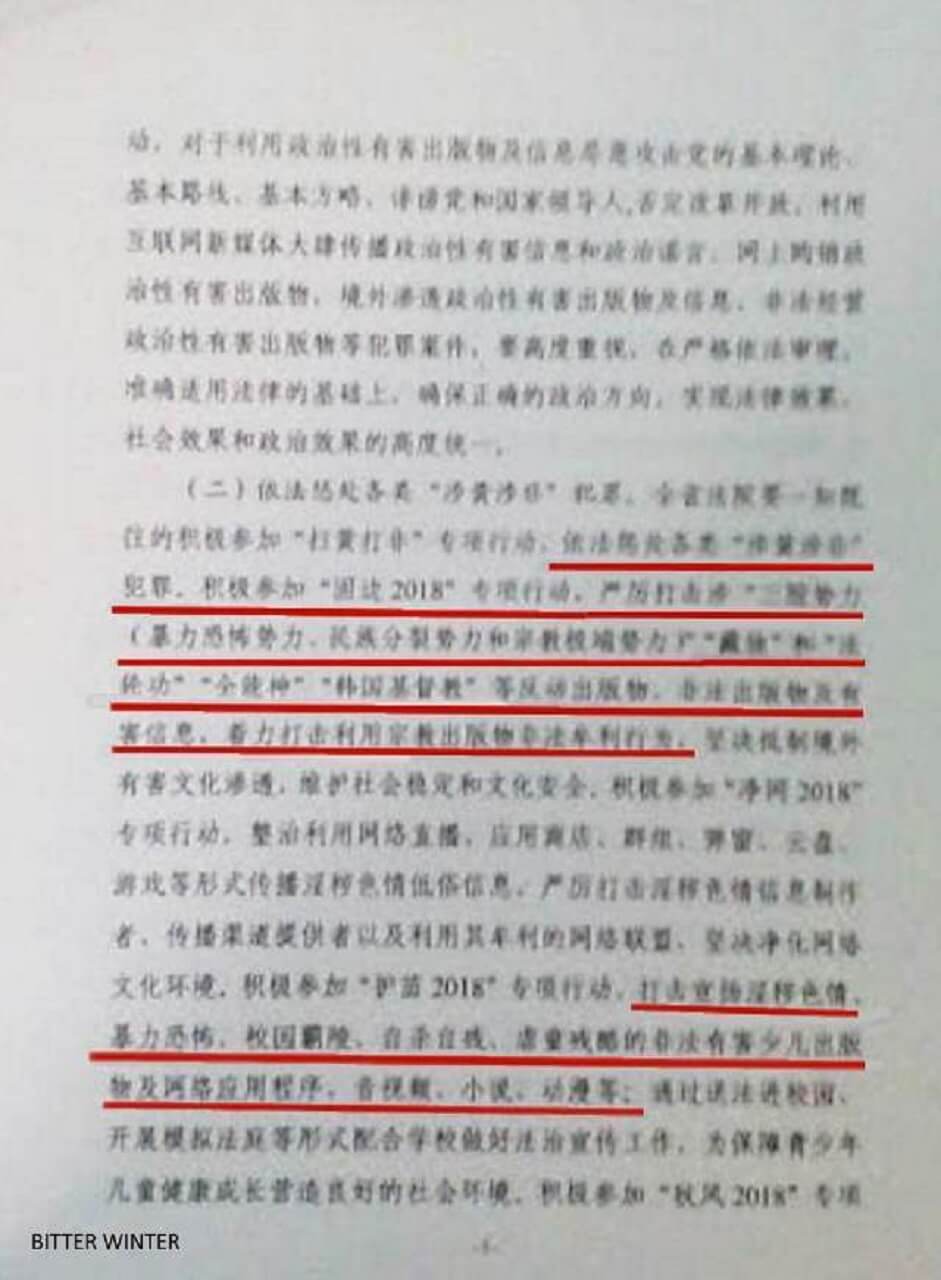 《全省法院2018年“扫黄打非”行动方案》中要求取缔这些宗教团体发布传播的“反动出版物及有害信息,着力打击利用宗教出版物非法牟利行为”,并且“严禁境外媒体非法采编活动” 。