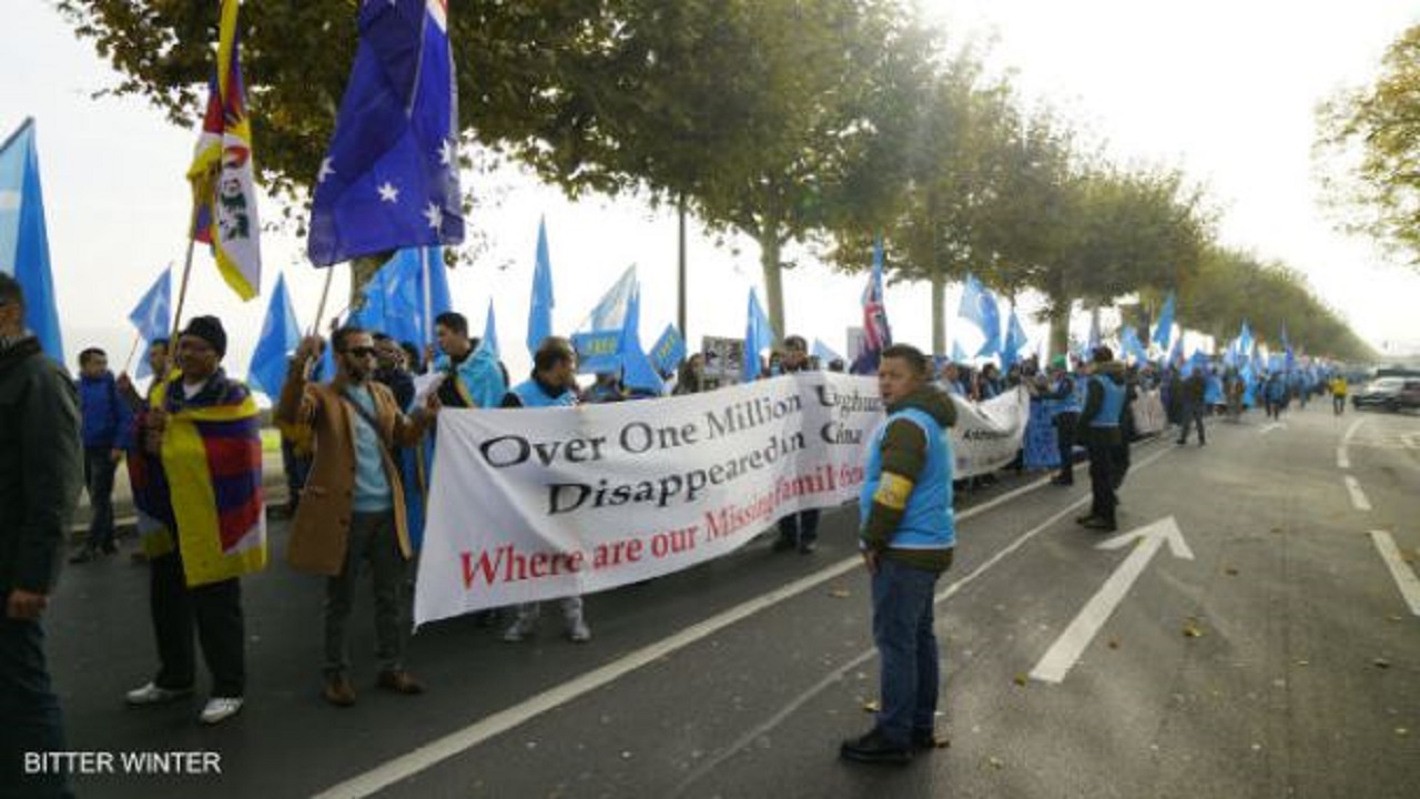 此次活动的组织方是海外最大的维吾尔族组织——世界维吾尔代表大会(WUC)。活动还邀请了其他受迫害的民族和宗教团体代表参加。这一天,示威的人们手举一面面国旗和被中共残害的受害者照片,迎着料峭刺骨的寒风,一大早就从雾气弥漫的莱芒湖畔的威尔逊宫出发,有序而和平地来到万国宫前。维吾尔人、藏人、内蒙古人、流亡到台湾的中国大陆人士、香港人权活动人士、全能神教会的基督徒,以及天主教信徒高喊口号,齐声讨伐中共及中国国家主席习近平。