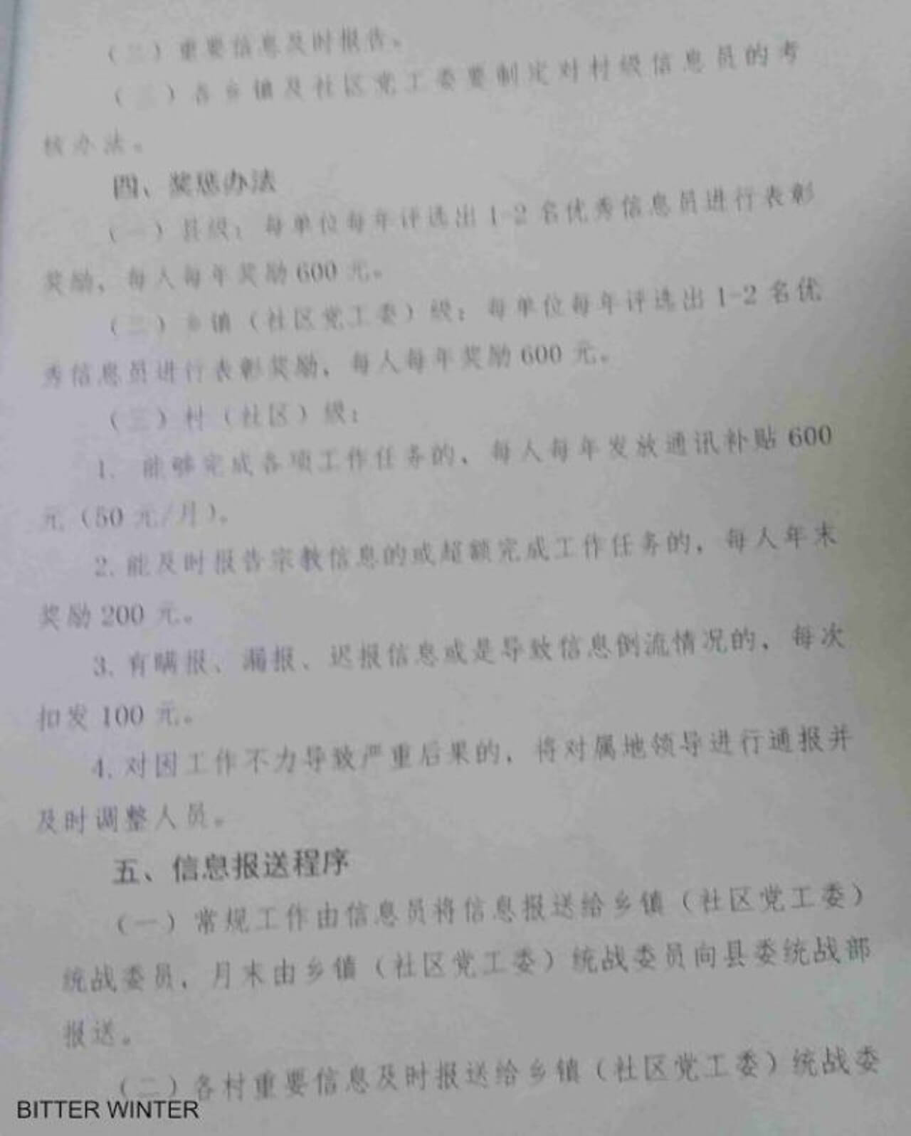 为了提高宗教信息员的积极性,当局给他们每人每年发放200至600元人民币(约29-86美元)不等的奖金;若瞒报、漏报或者迟报信息的每次扣发100元人民币(约14美元)。当局用这些奖惩措施来衡量宗教信息员完成“定额任务”的情况。