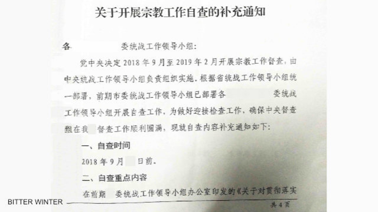 据一份中共内部文件显示,2019年1月起,中央督查组将根据今年的督查情况,集中精力落实整改任务。届时,很可能会带来新一轮的宗教迫害。