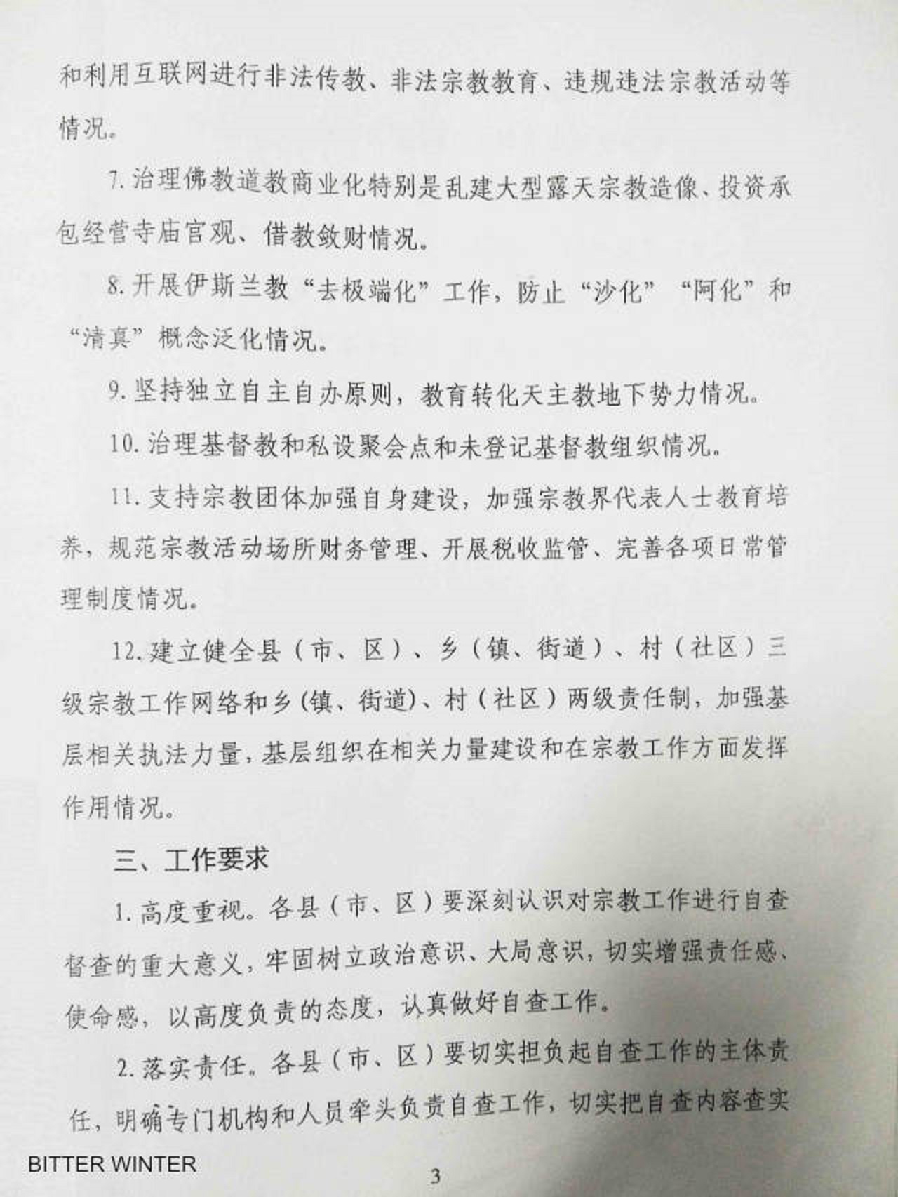 这次全国性宗教督查工作分为两个阶段。第一阶段为各地自查自纠阶段,要求各省市当局对其辖区内实施的反宗教措施进行评估,并将评估结果上报中央统战部。