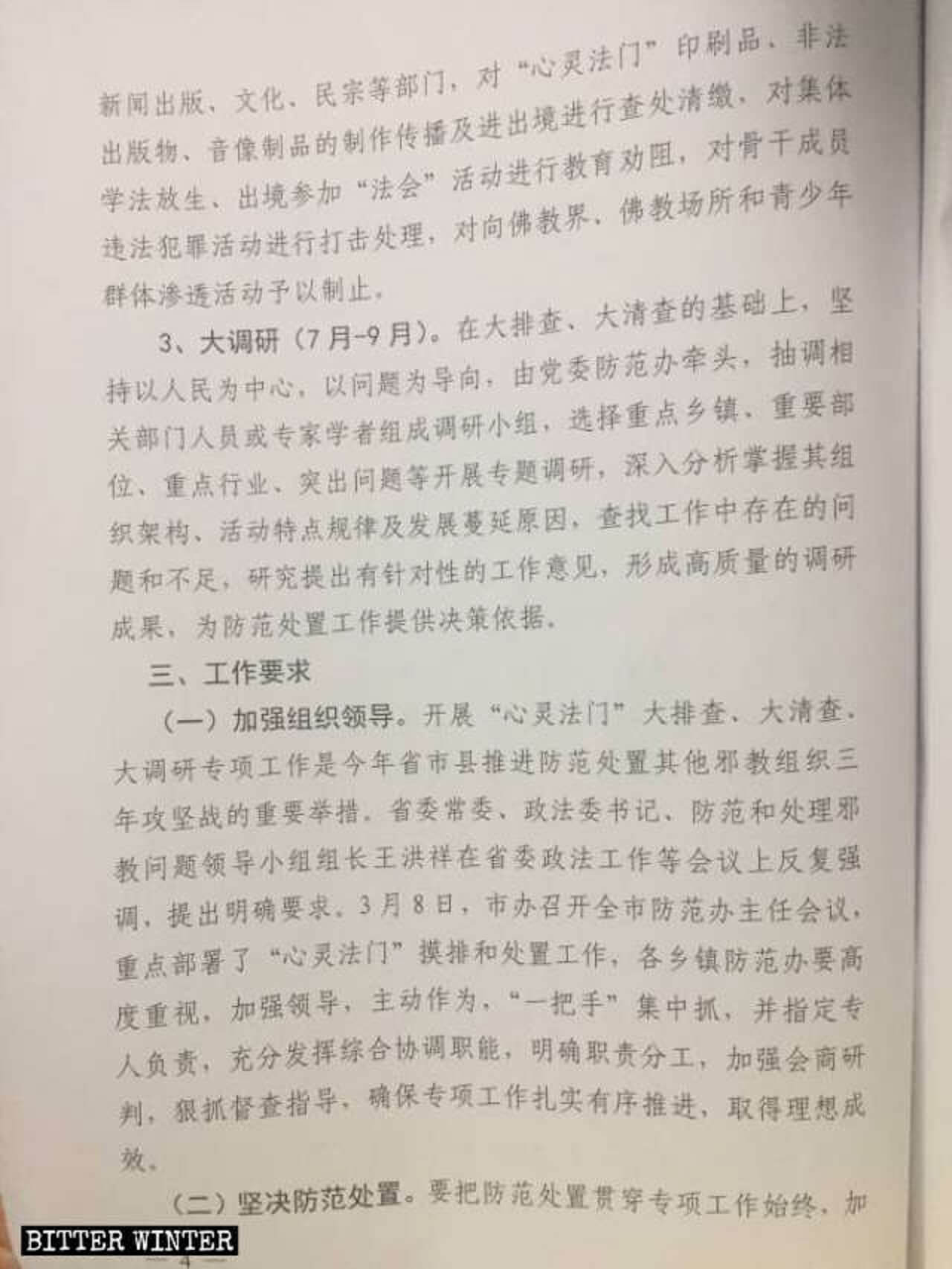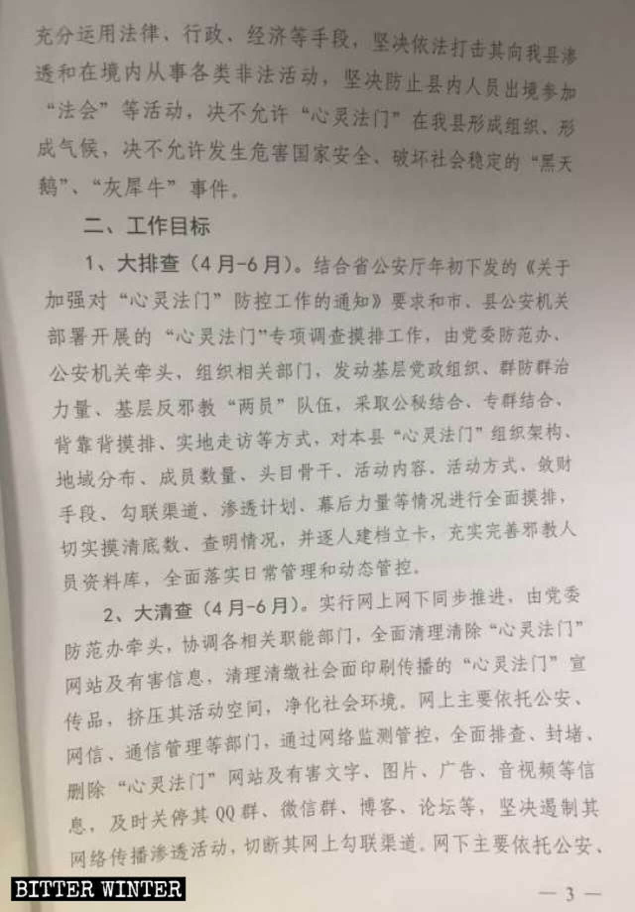 该文件还指出,要充分运用法律、行政、经济等手段,打击心灵法门在境内从事各种宗教活动,并禁止县内人员出境参加法会等活动。
