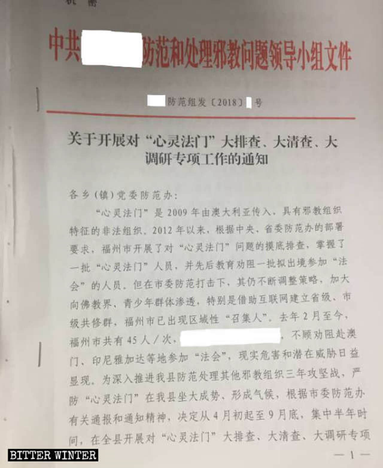 近日,《寒冬》获得一份福建省某县下发的机密文件——《关于开展对心灵法门大排查、大清查、大调研专项工作的通知》。该文件称,”心灵法门”于2009年由澳大利亚传入中国,发展迅速,因其未在中国境内合法登记,不受中共的管控,被定为”邪教”。