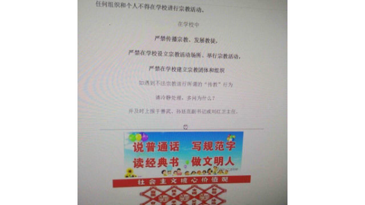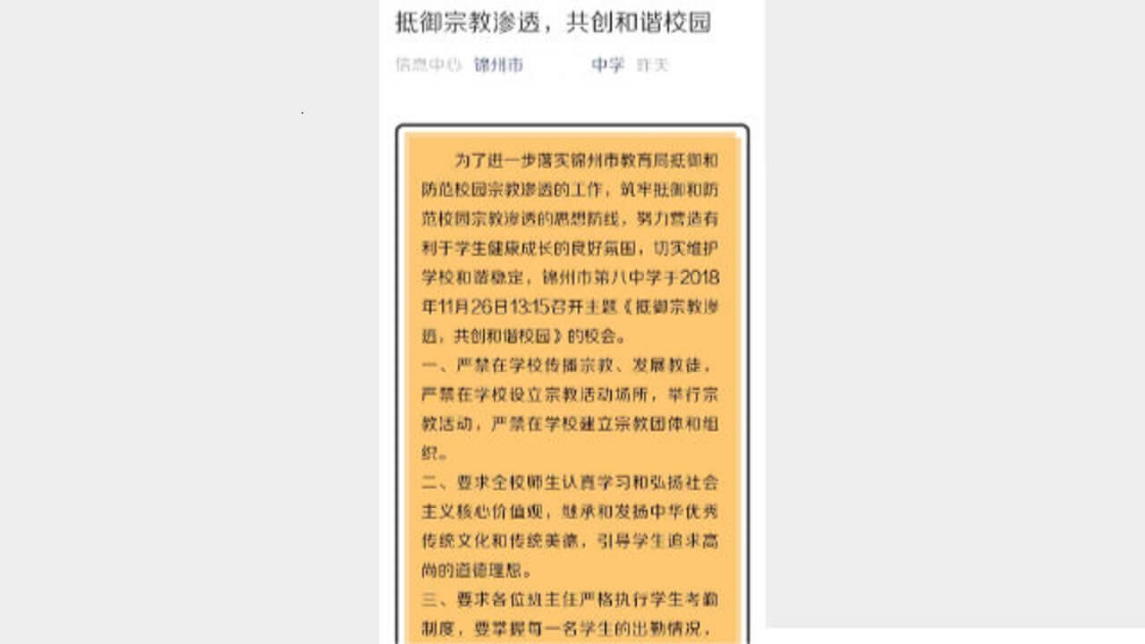 2018年11月下旬,黑龙江省讷河市某中学举行校园活动,要求师生在”拒绝宗教进校园”的大条幅上签名,还要求班主任以”崇尚科学,拒绝宗教进校园”为主题开班会,所有学生都要上交抵制宗教信仰的笔记。