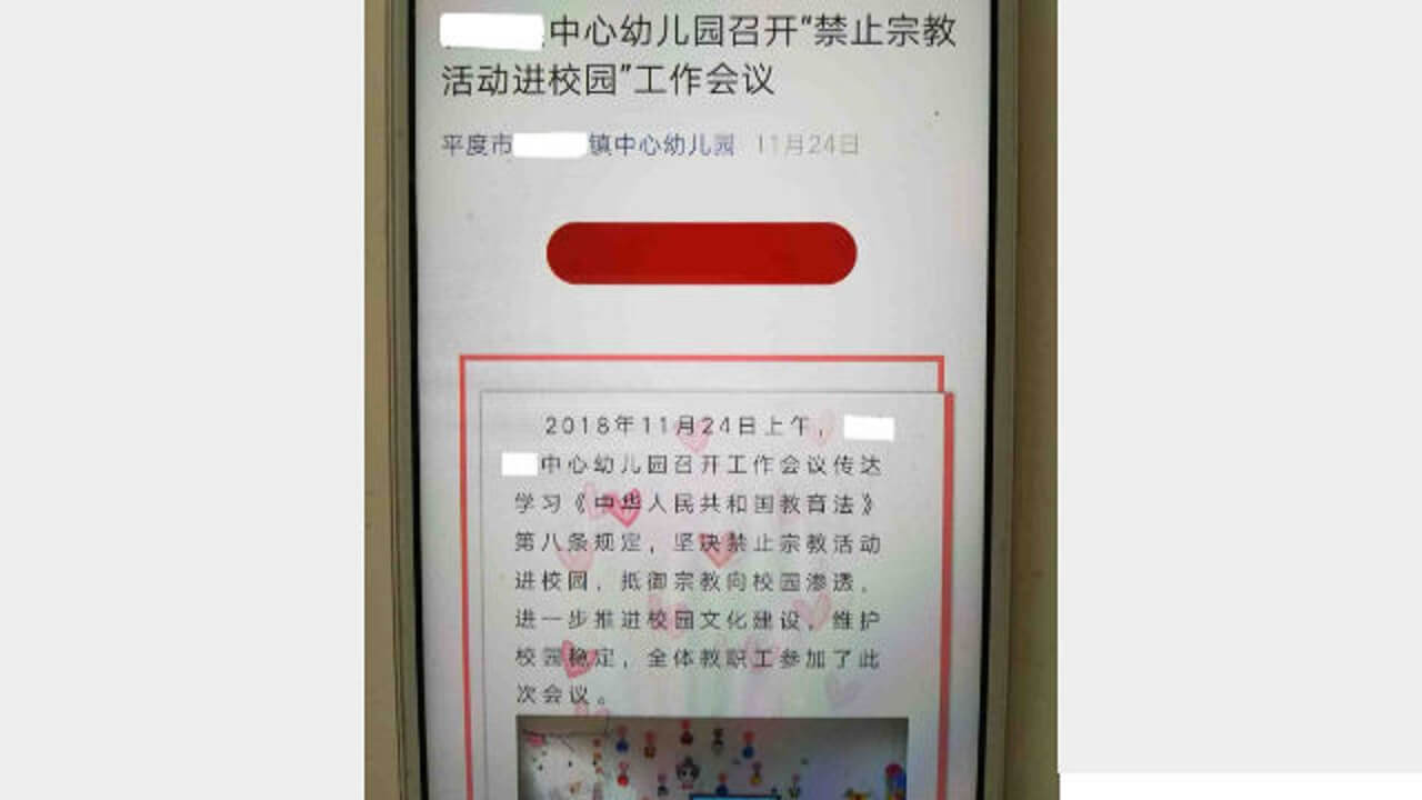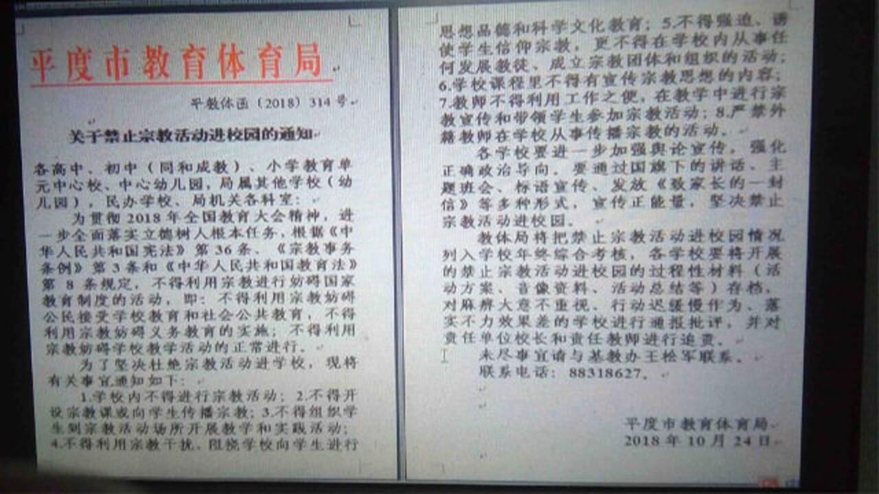 10月24日,山东省平度市教育体育局也下发文件,该文件针对各中小学、幼儿园,禁止学生参加任何宗教活动。