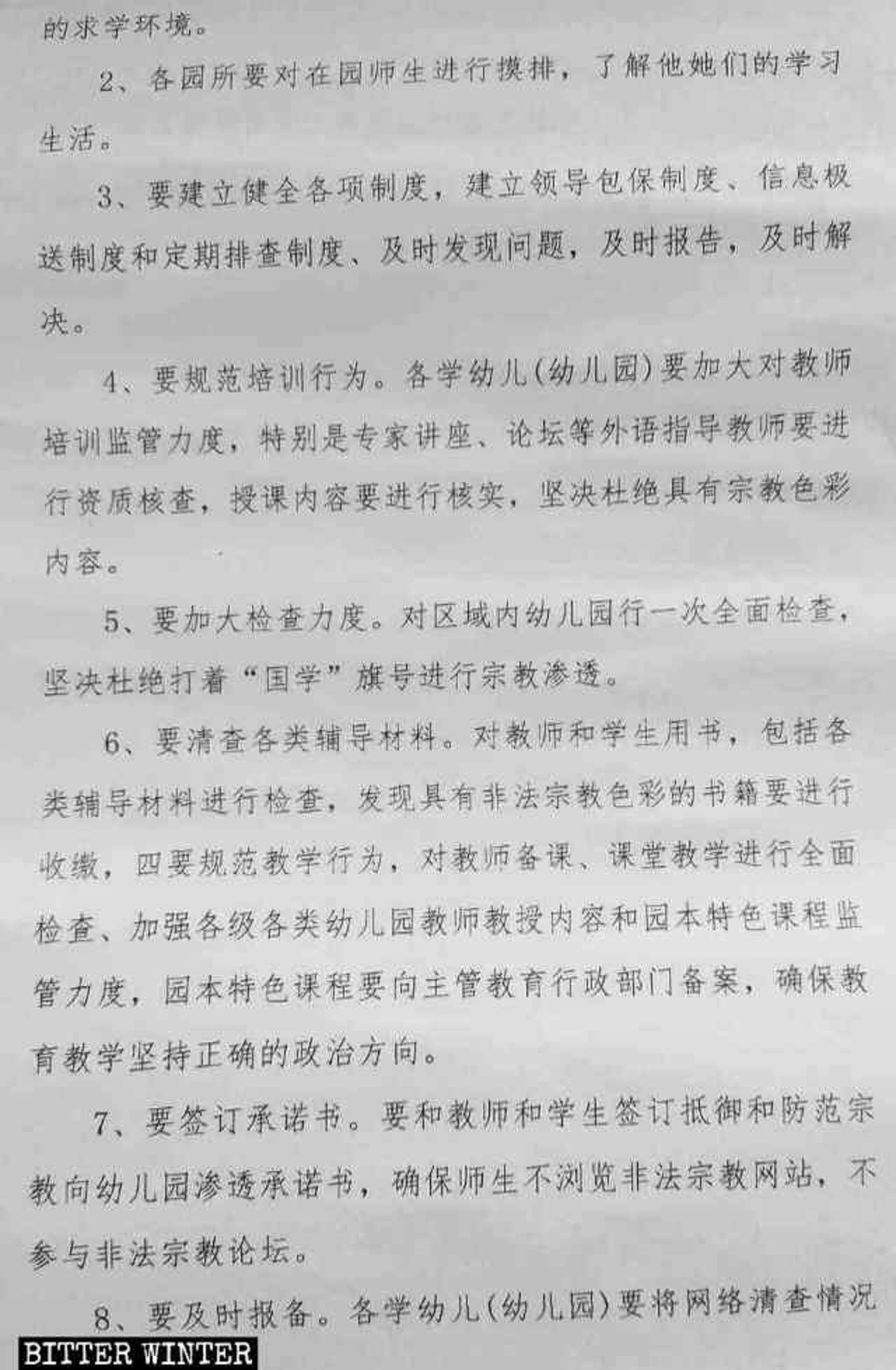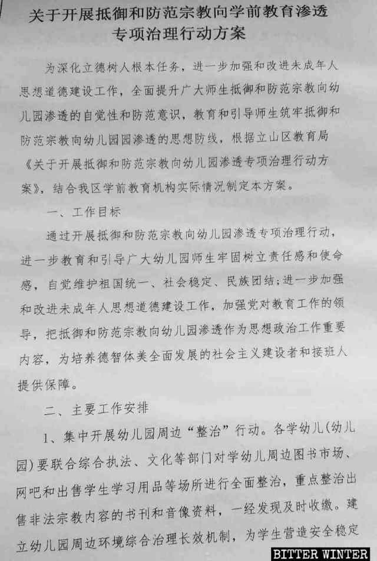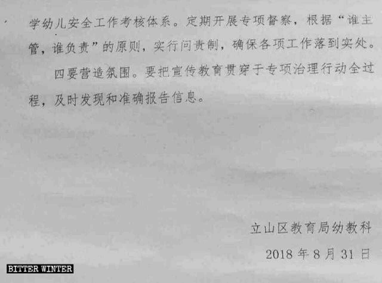 去年8月,鞍山市立山区教育局发布了幼儿园抵制宗教信仰的专项行动方案。该文件要求学校不准聘用有宗教信仰的教师;对于已经在岗的教师,要加大监管力度,对教师备课、教学进行全面检查,以杜绝任何与宗教有关的内容。学校师生必须签订承诺书,保证不浏览宗教网站,不参与宗教论坛。