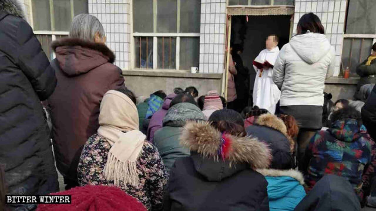 12月初,正值寒冬,信徒们在一偏僻狭小的院子内露天望弥撒。神父站在门口顶着寒风读经、讲道。教友们冻得瑟瑟发抖,只能跺脚御寒,老人和孩童缩成一团。