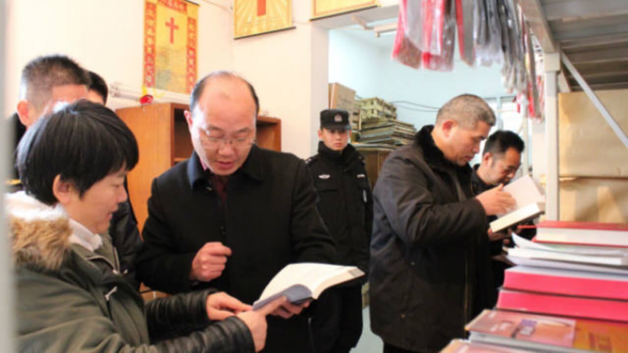1月16日,张家港市民宗局联合其他政府部门在教堂里检查非法宗教类书籍(网络图片)