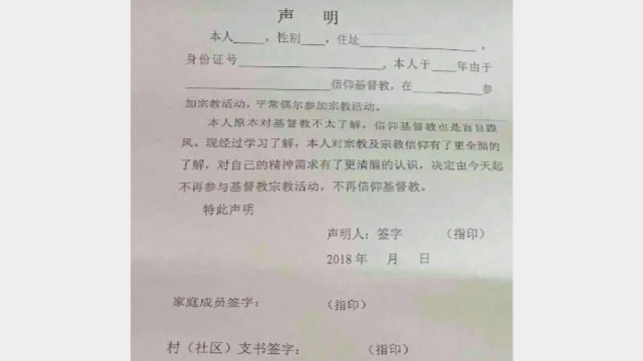 卢氏县基督徒李悦原本属于文明户。2018年7月,村支书让其在不信教的保证书上签字,遭到李悦的拒绝。“你不签就把你的名字报到乡派出所!”村支书恐吓道。
