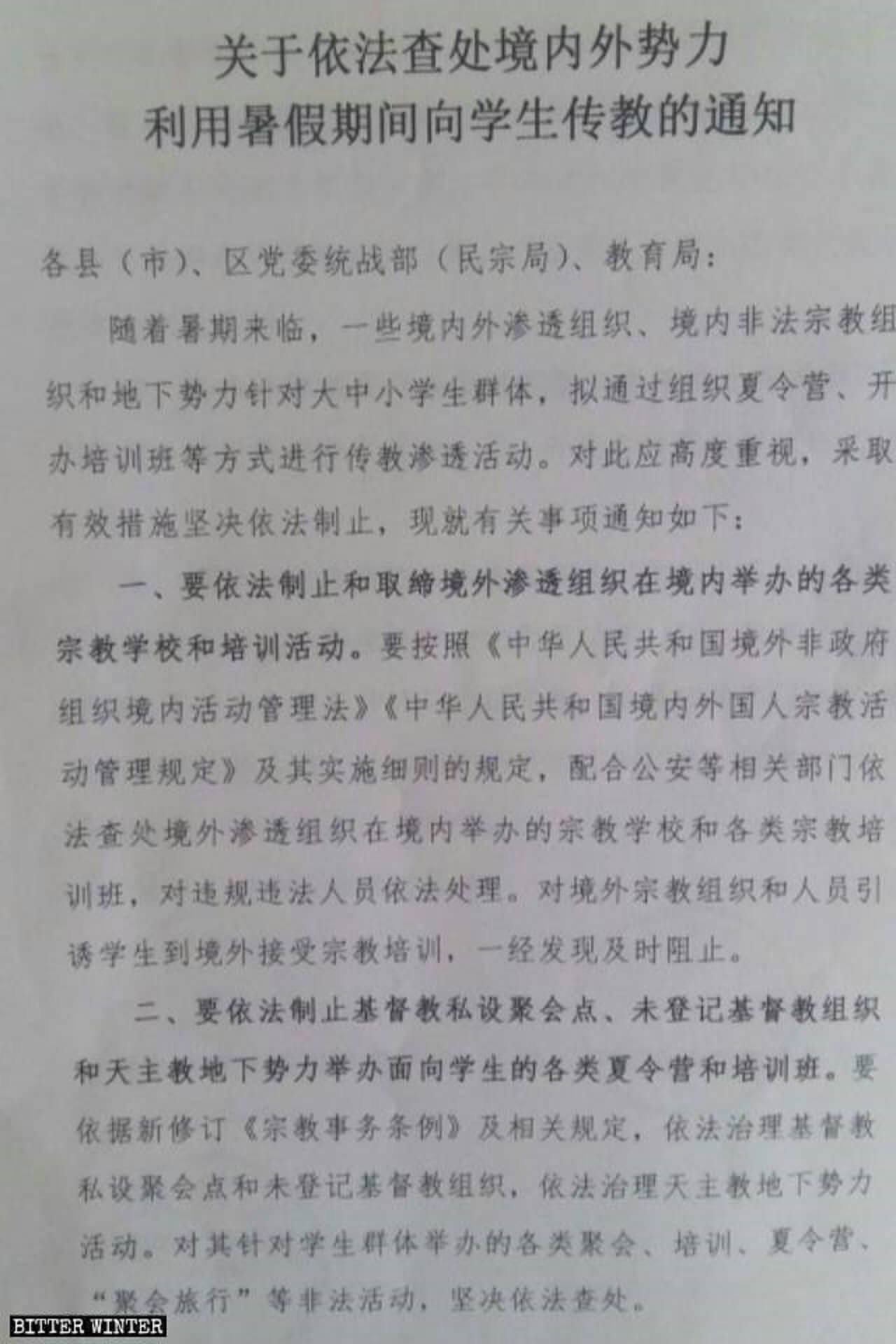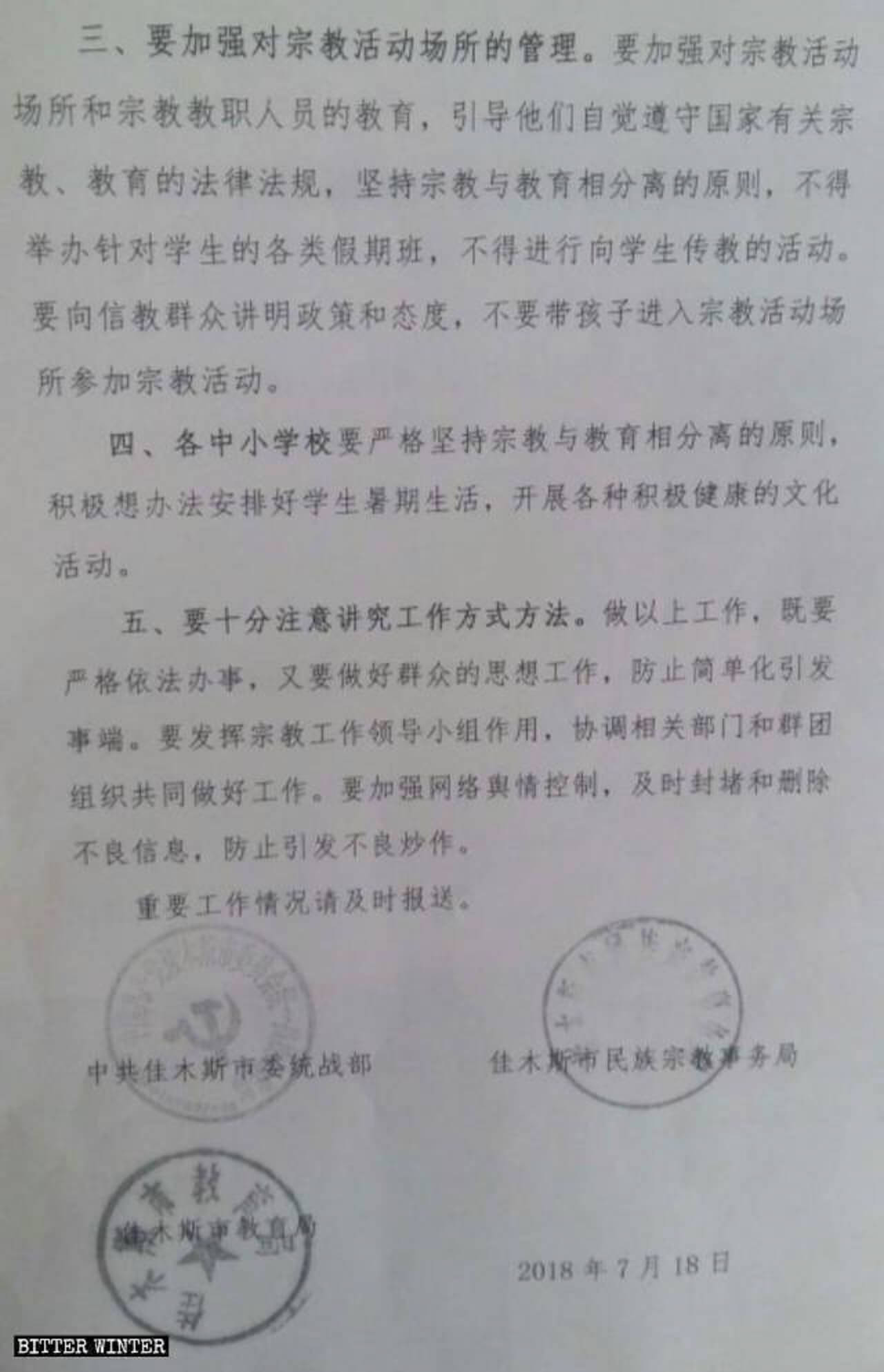 2018年7月18日,黑龙江省佳木斯市委统战部、市民族宗教事务局和市教育局联合下发了一份《关于依法查处境内外势力利用暑假期间向学生传教的通知》,禁止向学生传教。