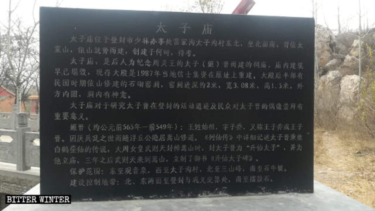位于登封市少林办事处雷家沟村的道教庙宇——太子庙,于2017年1月被当局评为 “登封市文物保护单位”。