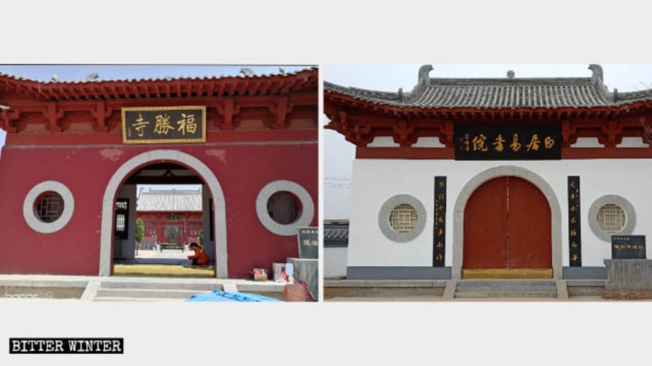该寺一僧人透露,早在2017年12月,福胜寺就被当地政府以 “无证” 为由关门;2018年10月底该寺庙里的观音像被当局封住,香炉被移走;今年2月23日该寺被当局改为 “白居易书院”,而且寺院被强行刷成白色。