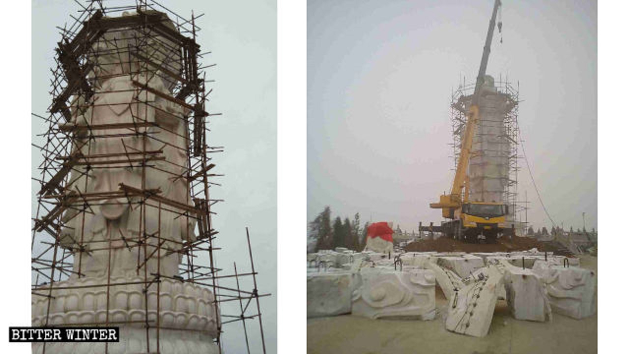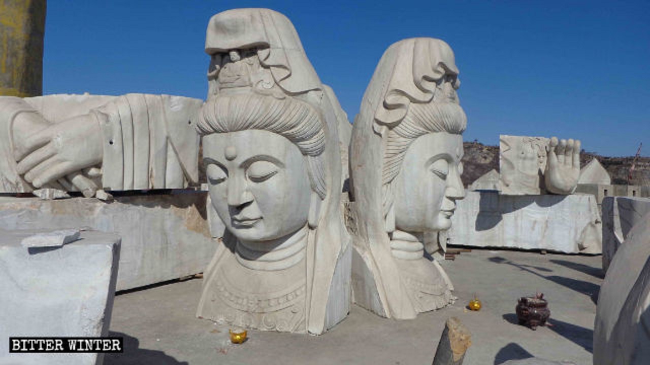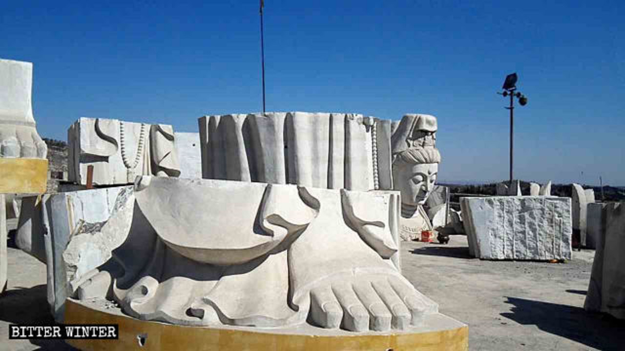 之后,当局雇用十余人的施工队和大型吊车,将观音像切割拆成49块。如今,只能看见被切割后的雕像零零碎碎地摆在地上。