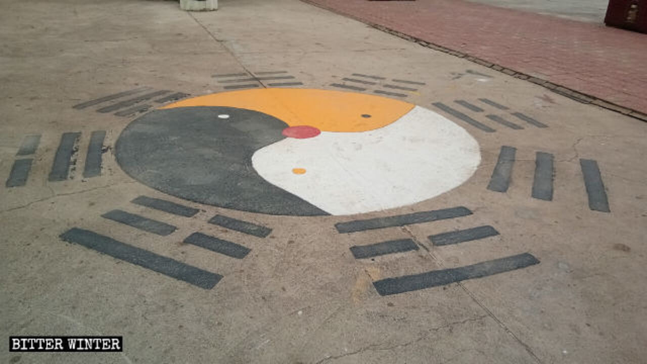 更为怪诞的是,该庙院内地面上绘有一副被称为八卦倒转乾坤三色鱼图。八卦图原为黑白两色,代表阴阳两方,现在却变成了黑白黄三色,中间还多出了一个红圈。据一女信徒解释说,这个圈代表毛泽东就是红太阳。