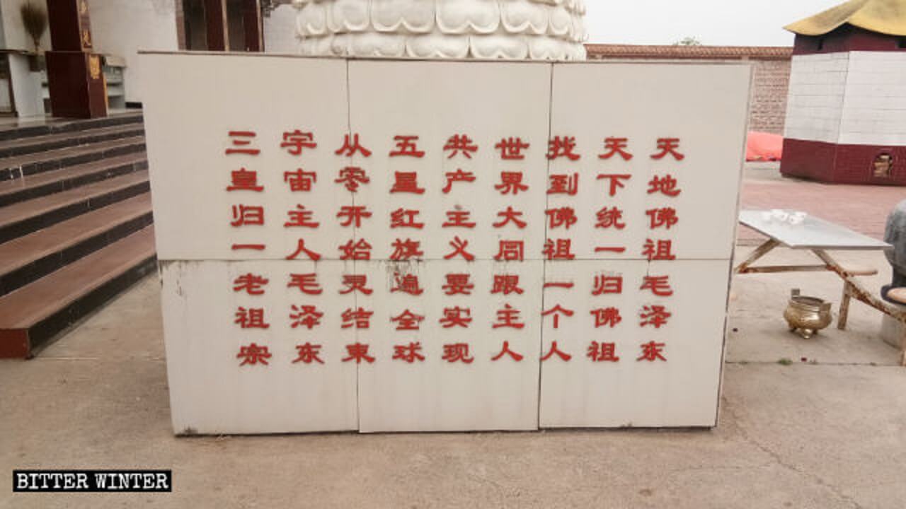 进入大院,一座大型露天毛泽东雕像赫然在目,雕像的底座上雕刻有将毛神化为 “佛祖” 的诗句,称 “毛主就是新玉皇,统天统地统人间”,将来道教、佛教等都归到毛泽东这一教。这似乎影射了共产党长期镇压宗教自由并企图称霸世界的野心目的。