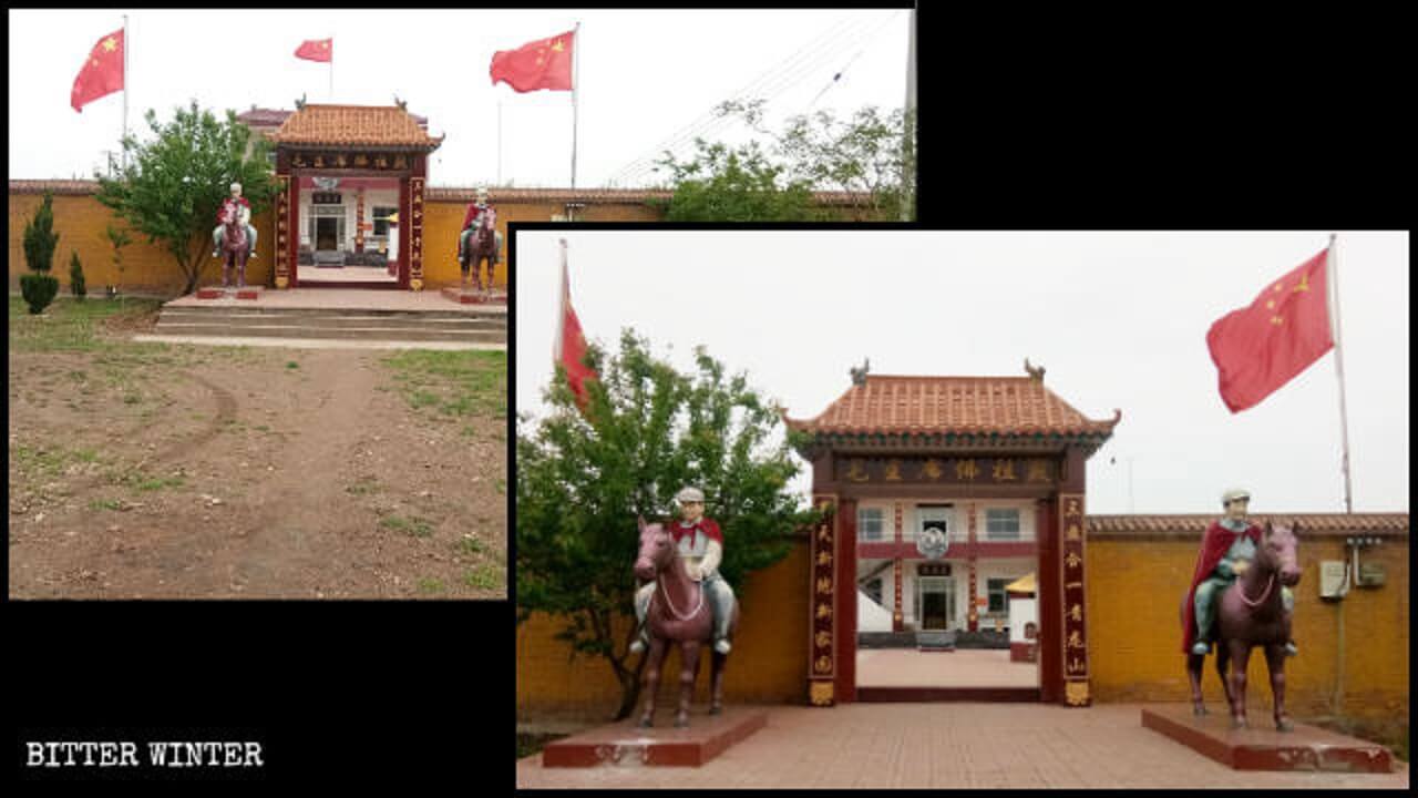 “毛主席佛祖殿” 位于汝州市寄料镇张坡村西约2公里处的青龙山上(原名西坡,建庙后改名青龙山)。该庙的大门两侧以及庙顶的最高处各插一面国旗,大门两旁有两个骑马大将军,左边是华国锋(毛泽东指定的接班人,前中共领导人之一),右边是董必武(中共开国元勋之一)。俨然是一处共产党的纪念馆。