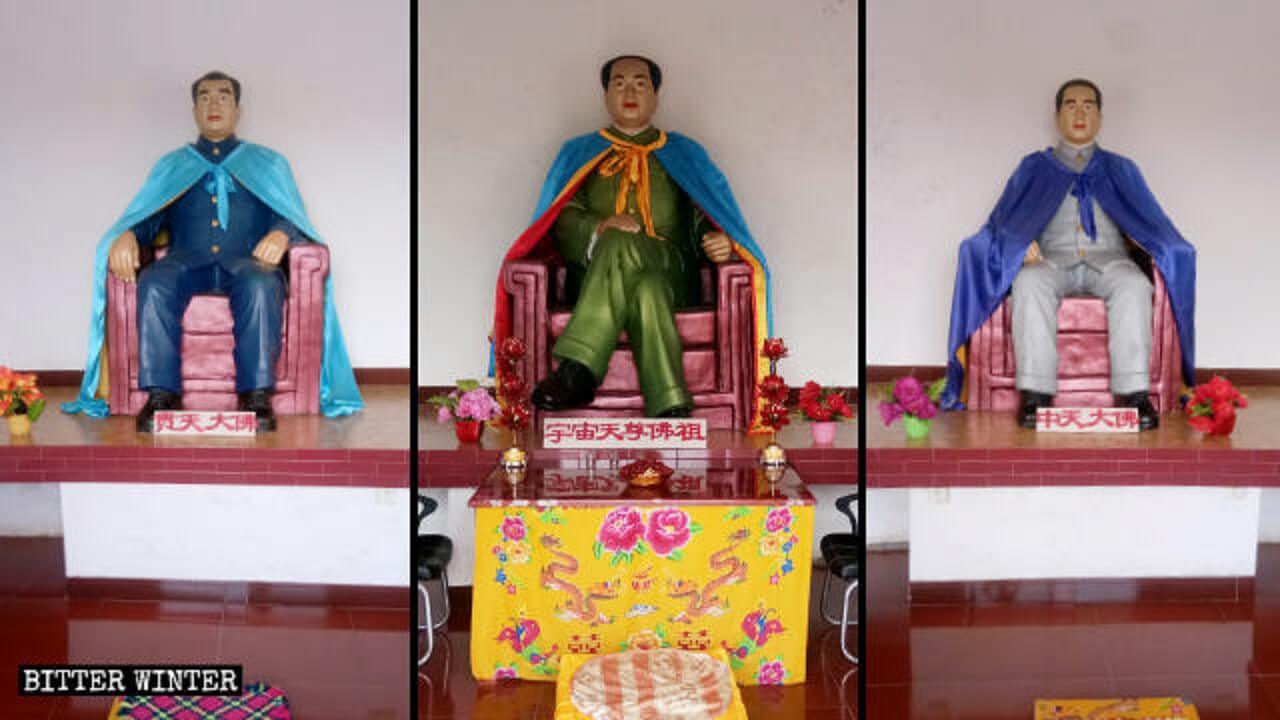 这座庙共两层,一楼正殿名为皇府殿,二楼正殿名为佛祖金殿,毛泽东的塑像被封为 “宇宙天尊佛祖” 置于正中间,在毛泽东塑像左右两边分别是中天大佛周恩来和贯天大佛朱德的塑像。两边墙上还挂着中共开国十大元帅彭德怀等人的照片。