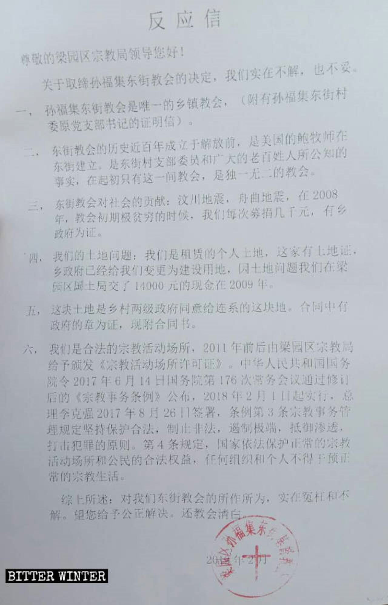 教堂负责人和信徒见政府如此野蛮,就试图通过法律途径解决问题,将村、乡两级政府官员告上法庭。但政府官员以 “撤销律师资格” 恐吓教堂聘请的律师,导致律师不敢接手此案。
