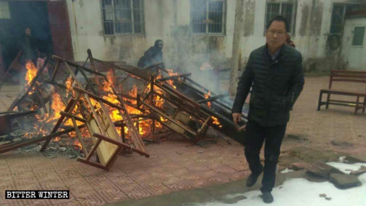 今年2月初,乡政府官员将教堂20多条联椅及座垫搬到院里烧掉,然后将教堂院门用砖头、水泥封死,禁止信徒聚会。