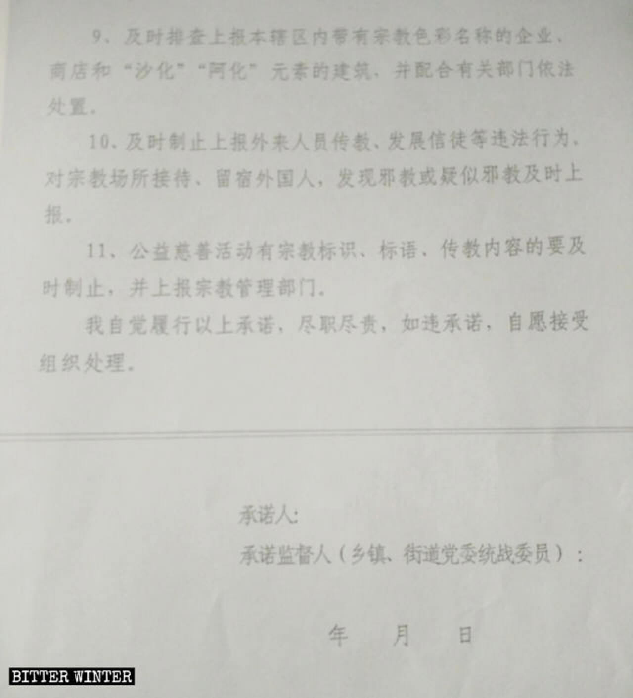 据一村主任透露,政府还在每个村设立宗教协理员,并要求其签订《村协理员工作责任承诺书》,该承诺书要求协理员经常到宗教活动现场巡查,了解场所内讲经和讲道内容,发现违规行为立即制止;经常巡查并制止辖区内私自建设宗教造像、私设聚会点等行为,并及时上报;及时制止外来人员传教、发展信徒等行为;还要监视举报外来传教人员、”邪教” 人员、接待留宿外国人的宗教场所,以及发展信徒的各种宗教活动。
