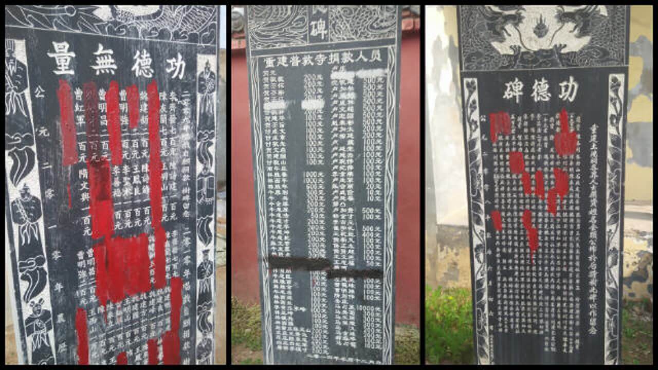 各村曾经捐款建庙的党员干部如临大敌,为保乌纱帽,纷纷销毁、涂抹功德碑上的名字,许多寺庙功德碑因此面目全非。