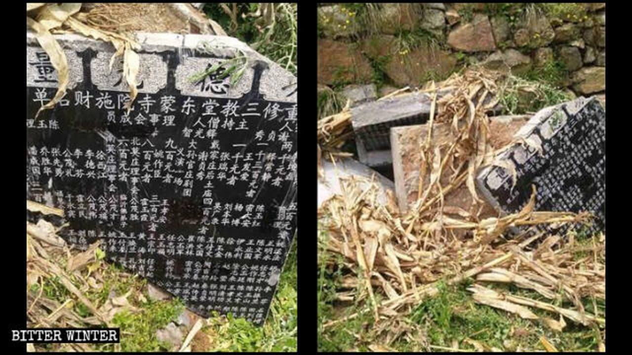 3月下旬,省纪委督导组到山东省临沂市蒙阴县排查党员信教情况。寺庙功德碑上有名字的干部急忙行动起来,一时间,蒙阴县多处寺庙功德碑被毁坏。有的寺庙负责人不愿毁掉功德碑,就在石碑上贴防火标语、环保标语等方式遮盖党员干部的名字。
