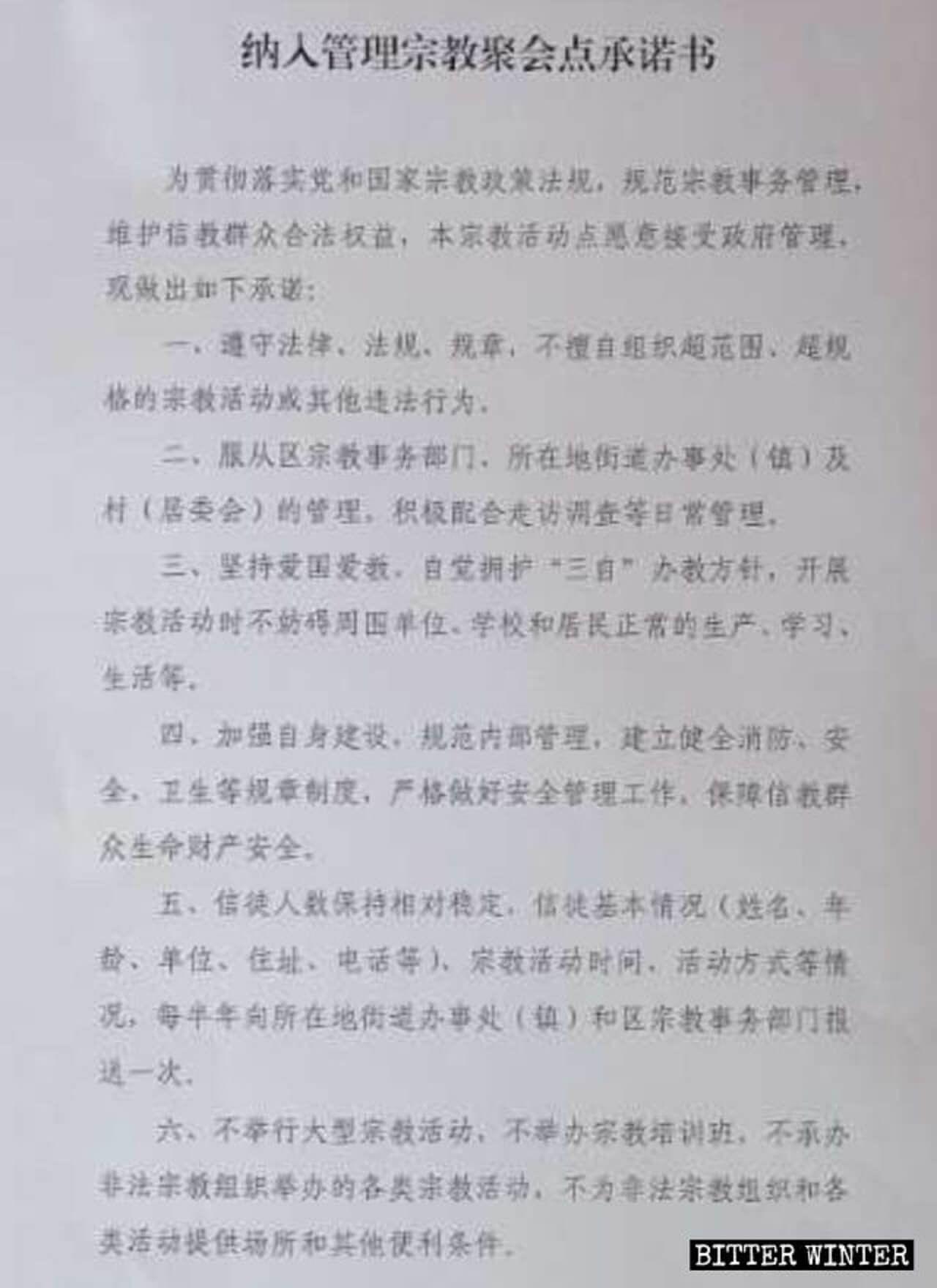 但中共似乎并不在乎梵方的态度。4月底,山东烟台当局要求该教区一神父加入爱国会,并签署一份承诺书,承诺教会信徒人数不再增加;信徒的身分信息,聚会时间、方式等情况必须每半年向宗教事务部门汇报;不举行大型宗教活动,不举办宗教培训班;等等。