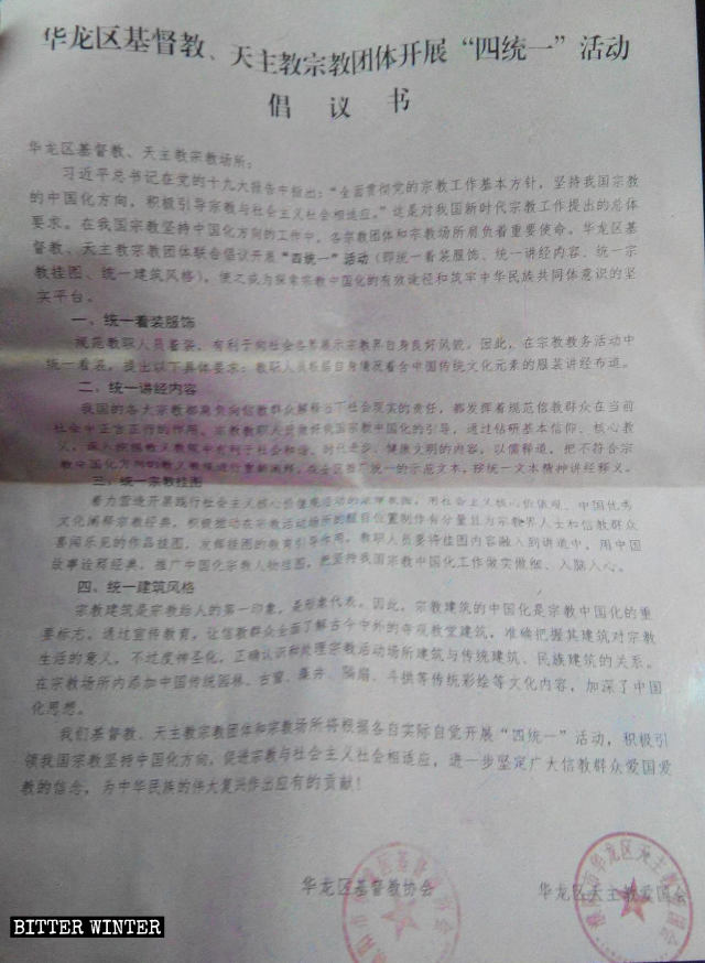 在落实宗教中国化上,河南省濮阳市华龙区基督教协会、天主教爱国会显得尤为积极。他们联合倡议开展 “四统一” 活动:即统一着装服饰、统一讲经内容、统一宗教挂图、统一建筑风格。