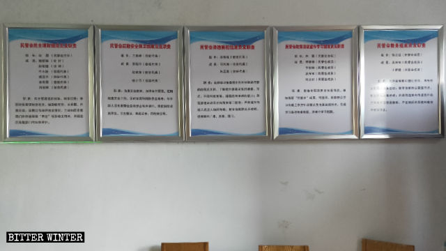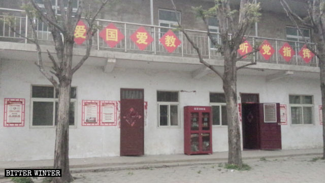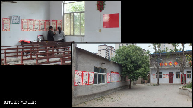 除了 “红色” 讲道进教堂,教堂的宗教标识也全部被 “中国化”。4月30日,新庄教堂讲台后方的十字架上方被挂上国旗,”以马内利” 被换成 “爱国爱教”,教堂内各个地方贴的 “爱” 字全部被剜掉,墙上都挂上 “传统文学”、”传统美德”、”爱国教育宣传挂图” 的牌匾,就连教堂栏杆上也挂上了 “爱国爱教,听党指挥” 的标语。