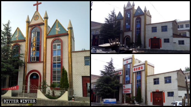 4月19日,县宗教局局长来到柳泉镇三自教堂,威胁该教堂负责人若教堂整改不到位,就将教堂查封。四天后,村干部带着六名工人将教堂顶端的十字架、欧式建筑强行拆毁,并将教堂内18个欧式窗户全部改为中国样式。