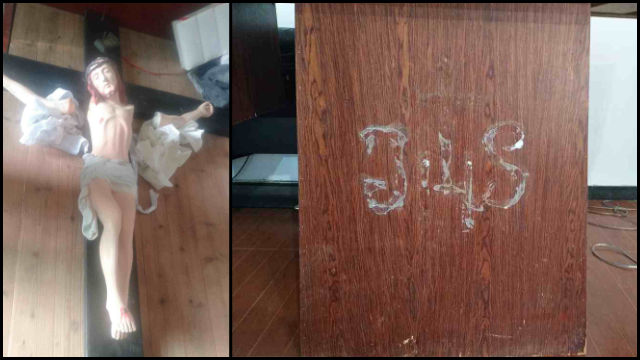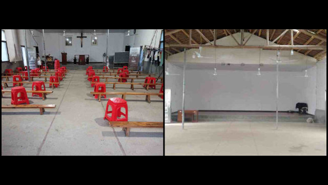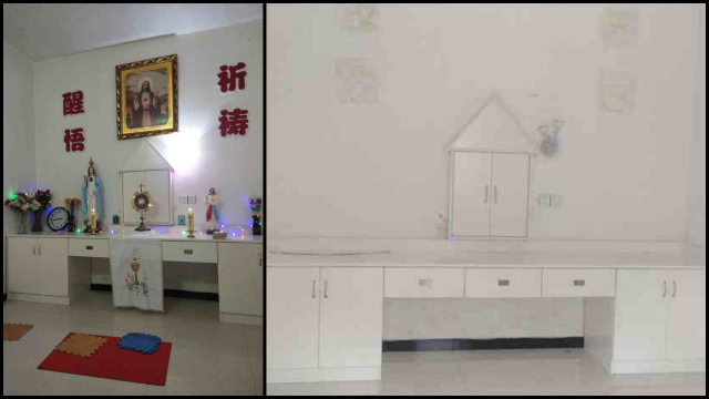 “等我们赶到发现,正面墙上的耶稣十字架像已被拆毁丢到后山水沟。两边墙上挂的用相框裱好的圣像被砸烂摔在地上,就连祭台桌正面的圣号也被戳掉。” 一位要求匿名的教友回忆突袭之后所见到的情景说。