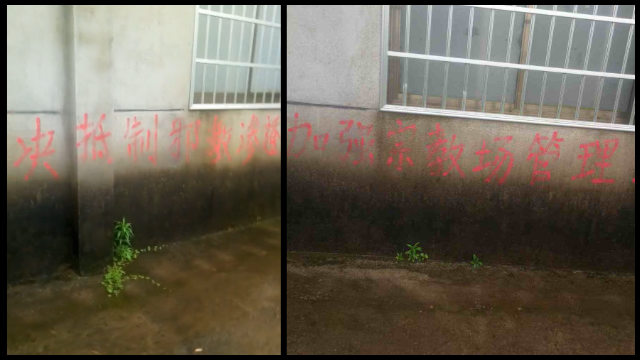 5月13日,当地官员再次非法搜查聚会所,并查抄了位于聚会所旁教会的一栋两层小楼,将里面所有天主教信物没收。聚会场所外墙上写上了 “加强宗教场所管理坚决抵制邪教渗透” 的标语。