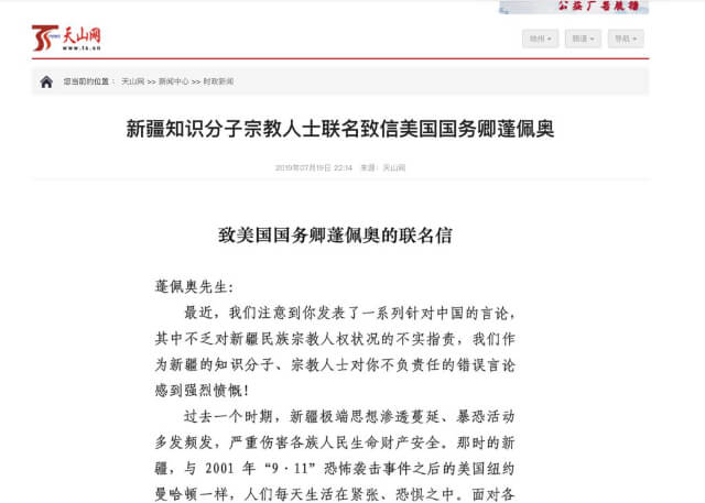 上周,在华盛顿特区召开的促进宗教自由部长级会议上,美国国务卿迈克·蓬佩奥(Mike Pompeo)谴责中共虐待维吾尔人的暴行,称之为 “本世纪的污点”,随后,新疆中共政府的官方喉舌天山网就发布了一封 “维吾尔和哈萨克学者” 联名写给蓬佩奥先生的信,企图反驳其言论。
