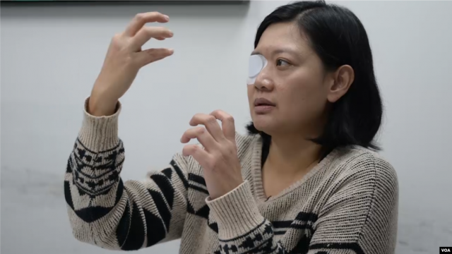 如今,她的右眼仍然缠着纱布。医生告诉她,那只眼睛永远无法再见光明。英达告诉美国之音,说这话时,一位医生哭了。