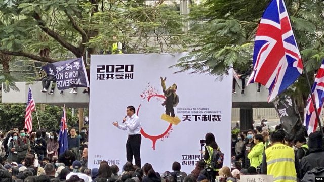 香港 — 香港民间集会团队组织的“天下制裁”集会19日在中环举行。集会的诉求是“立即民主政改 否则天下制裁”,要求香港政府实施政治改革,在今年的立法会选举中取消功能组别,进行没有政治筛选的选举,否则面临全世界各国的制裁。本来这是一次集会加游行,他们原来的计划是从中环游行到铜锣湾。但遊行未得到批准。