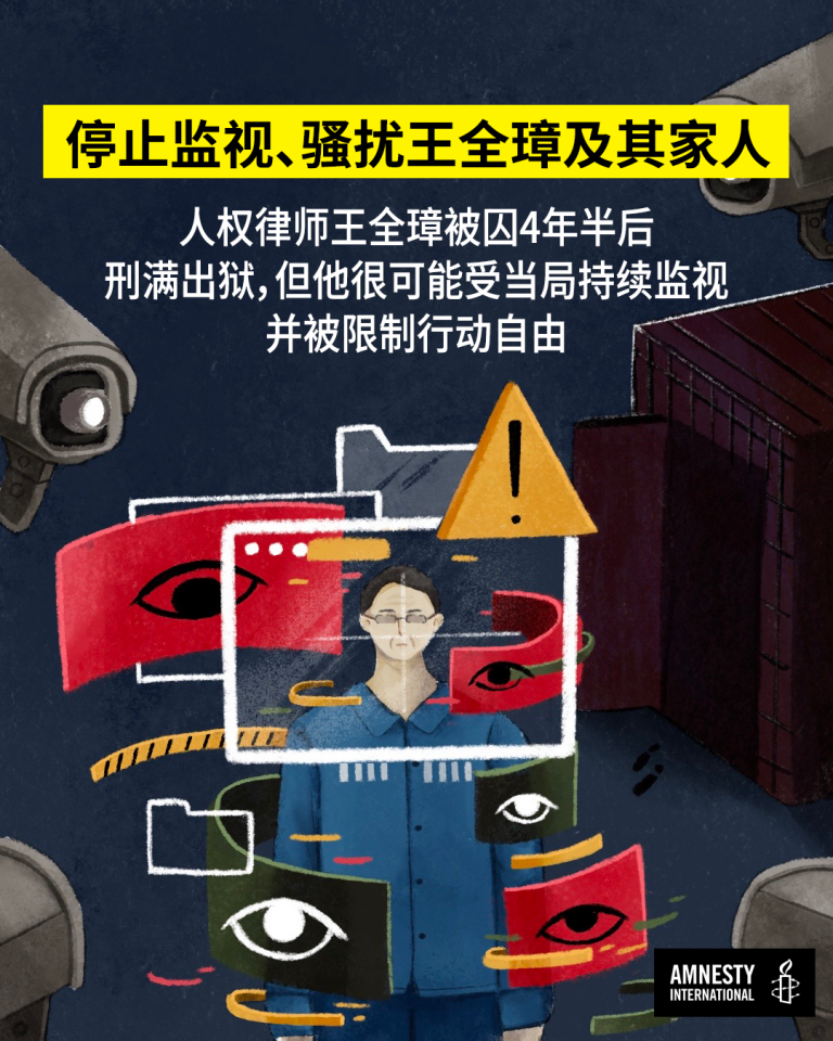 王全璋律師及其家人已經受夠苦了。我們促請中國政府遵守《中華人民共和國憲法》第三十七條, 以及《世界人權宣言》第三條和第十三條,保障王全璋獲釋後的人身自由,確保不再軟禁、監視或限制他的人身自由。