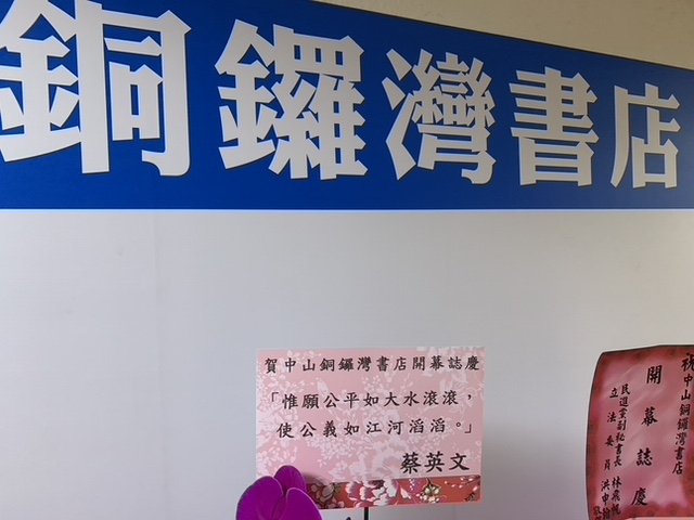 铜锣湾书店门口,蔡英文总统送来的花篮被摆在显眼的位置,写着“惟愿公平如大水滚滚、使公义如江河滔滔。”