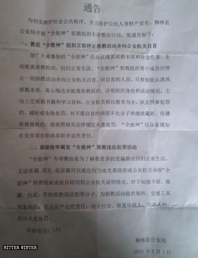 2020年2月1日,正值疫情高峰时期,山西省吕梁市柳林县公安局对全能神教会展开“专项整治行动”,并鼓动民众举报全能神教会基督徒。