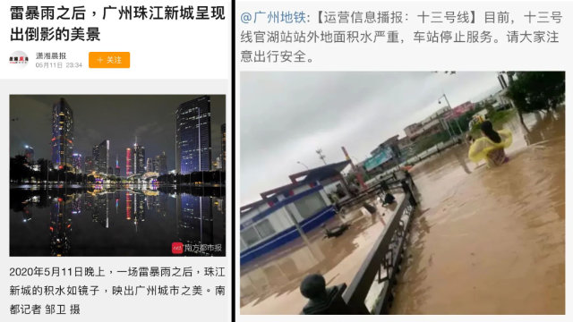 这种利用“正能量”新闻操控舆论的例子很多。5月11日,广东省广州市一场大雨过后,一地铁站被淹,而当地官媒却报道该区雨后的城市美景,并没有报道民众受灾的问题。