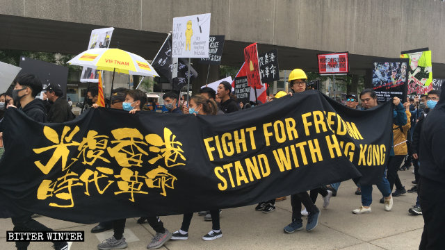 统一穿着黑衣的参会者,高唱《愿荣光归香港》于2点45分左右开始游行。他们高举加拿大国旗,还有印着紫荆花图案的黑旗,高喊“光复香港,时代革命”“结束一党专政”“打倒共产党”等口号有序前行,游行队伍绵延数公里。