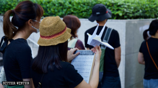参与者还将写有“你们的勇敢让我很感动”“为自由而战,我们支持你”“香港加油”等祝福语的千纸鹤交给活动的主办方,以表示对香港民主运动的支持。