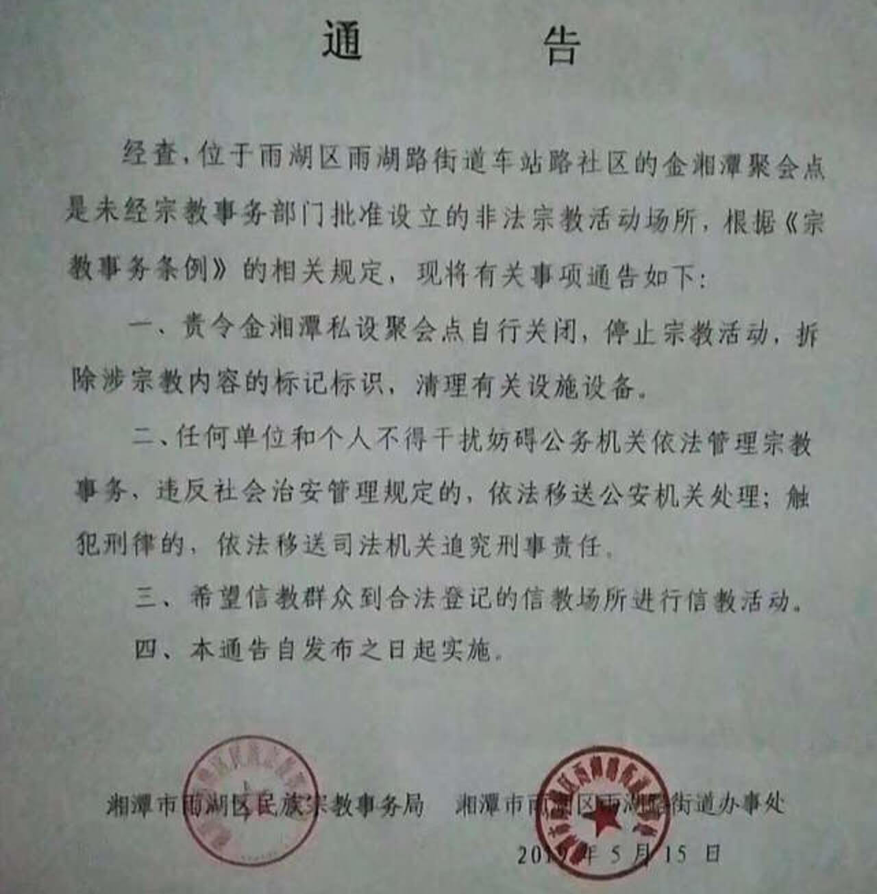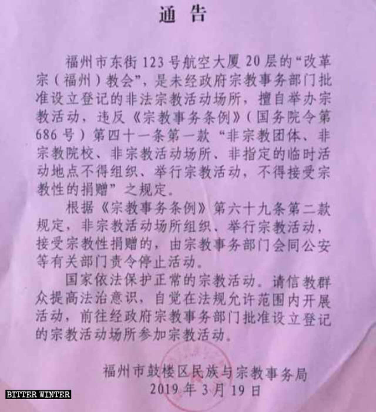 随后,警察在教会门口贴上取缔该聚会点的公告。