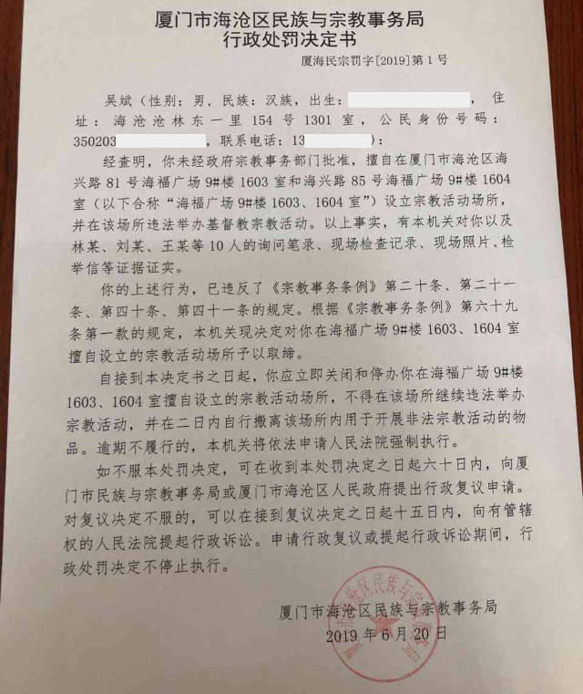 6月20日,福建省厦门市海沧区海福教会也被取缔。当地民宗局称,该教会 “非法聚会、扰民”,并试图强迫教会负责人吴斌加入三自教会,遭到拒绝。